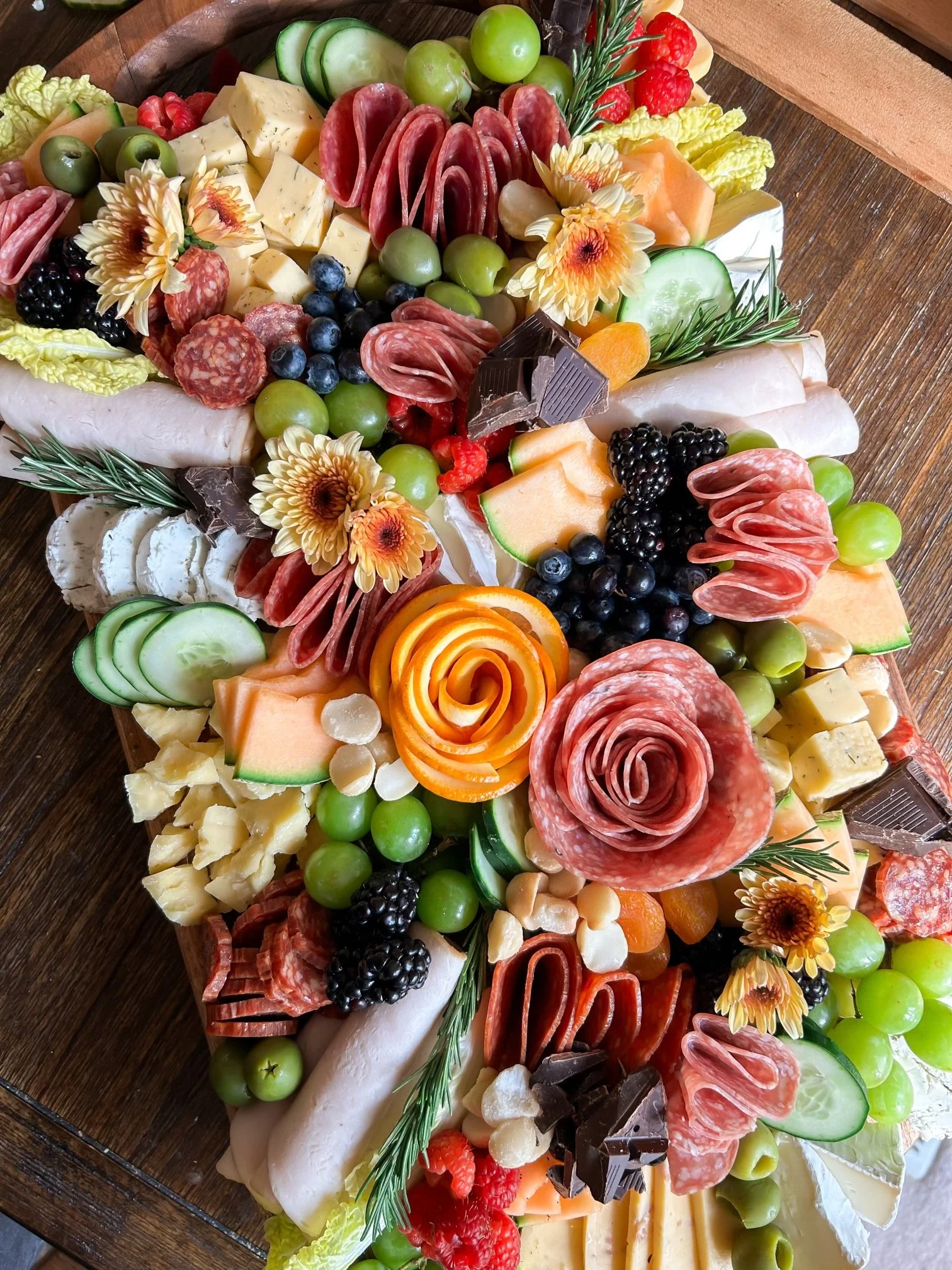 A Medium Charcuterie Board features 5-6 varieties of cheeses, 3-4 types of charcuterie, crackers, fresh fruit, dried fruit and nuts, a spread (such as jams, honeys, mustards or chili crisp), something sweet, like chocolate, and as always…something salty, like olives or pickles. Platters will vary depending on season, special accommodations, and size of your party.
